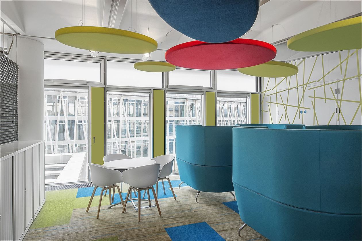 Large office spaces or residential lofts often echo, which can be distracting or impact productivity. BuzziSpace has developed the BuzziLand, a sound absorbing panel that can be fixed to the ceiling or walls to dampen sound waves while still offering a chic design.
